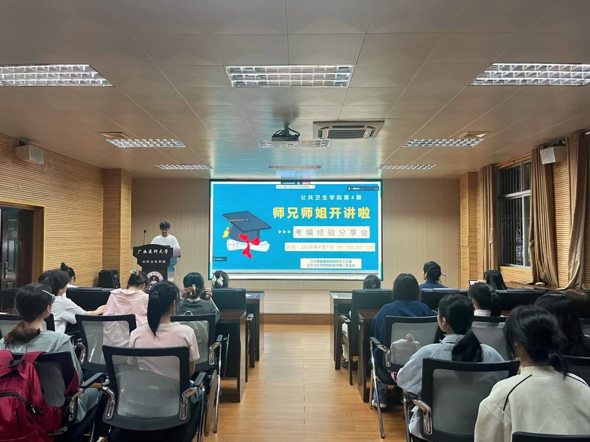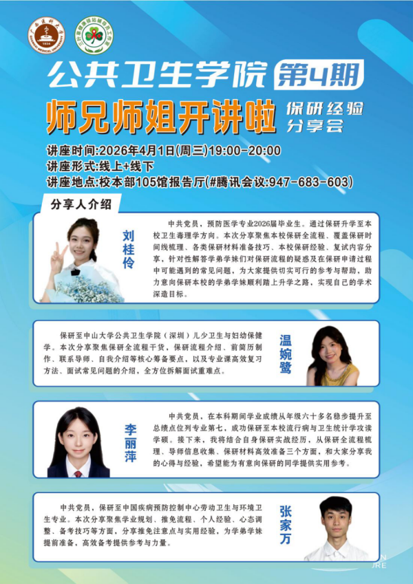 当前位置:学生工作为助力学生明晰保研路径、做好学业规划,4月1日晚,PG电子游戏平台 在105馆会议室举办第4期“师兄师姐开讲啦”——保研经验分享会。本次分享会由预防医学第二党支部承办,邀请2026届刘桂伶、温婉鹭、李丽萍、张家万四位保研学子担任主讲人,各年级同学踊跃参会。