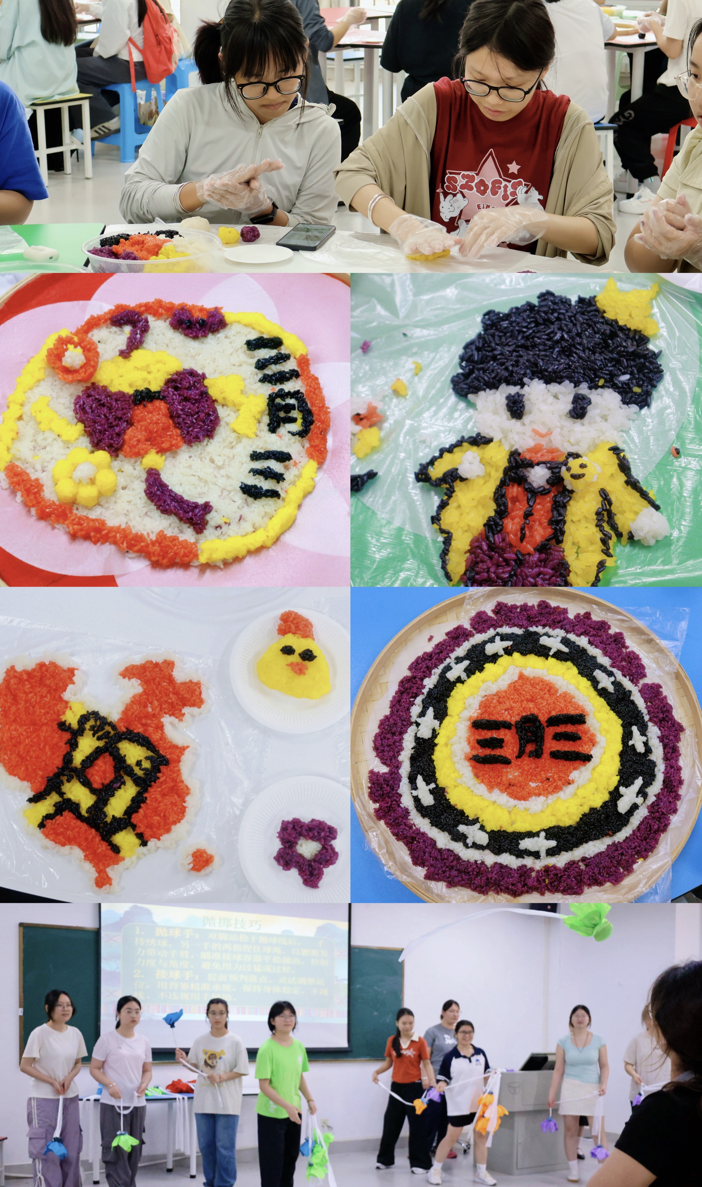 武鸣校区五色糯米饭趣味创作中,同学们以糯米为笔勾勒壮锦纹样与民族图腾;绣球投投乐赛场上,趣味问答点燃氛围,抛投竞技间传递民俗祝福。