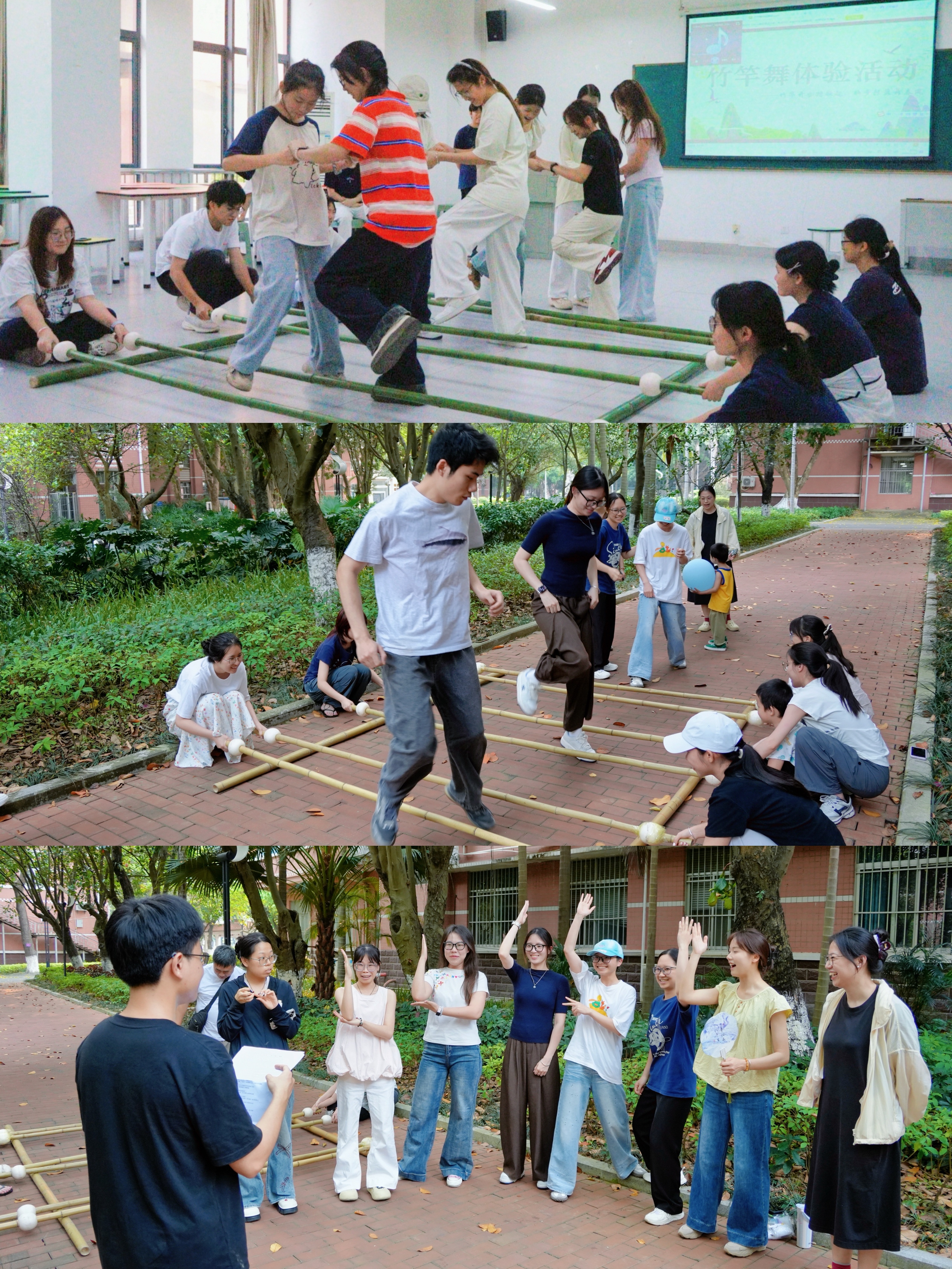 竹竿舞作为两校区共有环节,将活动推向高潮——竹竿开合,踏歌而起,学子们在节奏中轻盈起舞,欢声笑语跨越校区界限,生动诠释“中华民族一家亲”的深情厚谊。
